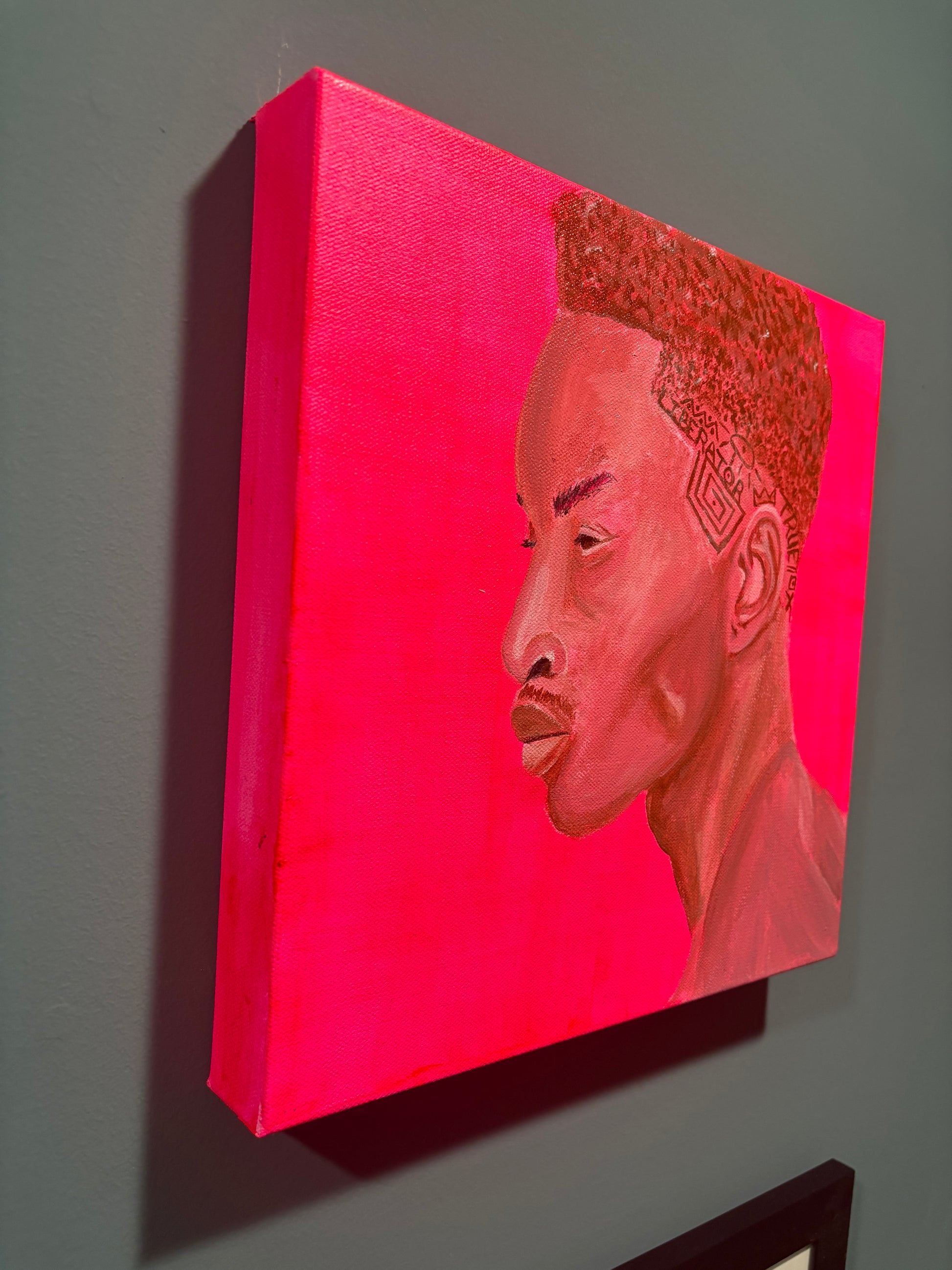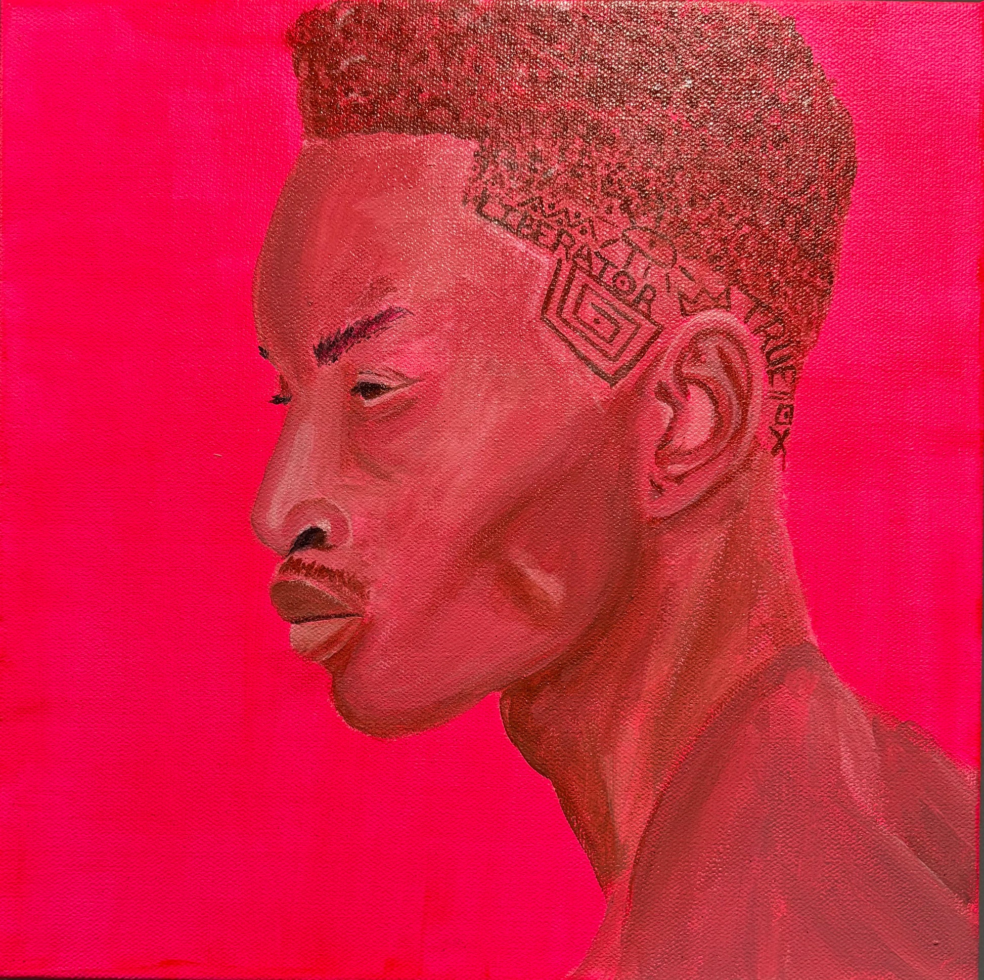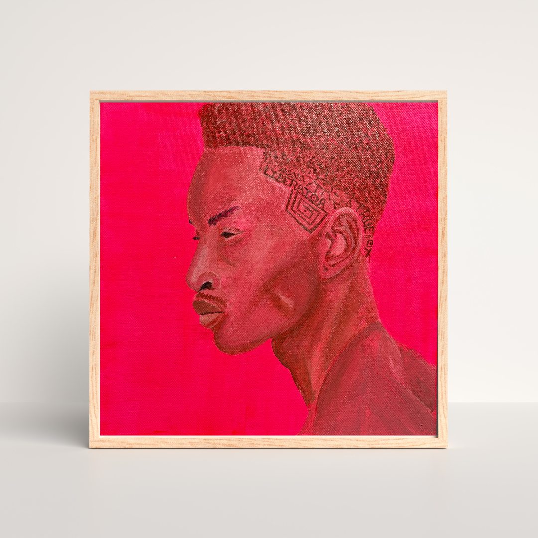 I exist in a world of pink, radiant, unapologetic, and alive. My face carries the calm strength of a man who knows his worth. Look closer and you will find the symbols etched into my hair: an all-seeing eye, a crown, and the words “Liberator” and “True.” Each mark tells a story of vision, power, and the unshakable belief in freedom.